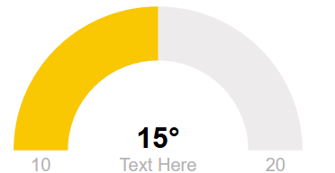 This code snippet creates a justGage and adds it to the page. The properties *Maximum* and *Minimum* refer to the maximum and minimum values of the gage respectively. *Value* is the current value of the gage. Note that *Maximum*, *Minimum* and *Value* are all floats. Next, the *Symbol* is set to a degrees symbol so that it will appear after the Value. Finally, the *Text* is set to "Text Here". This code will produce a gage that looks like this: